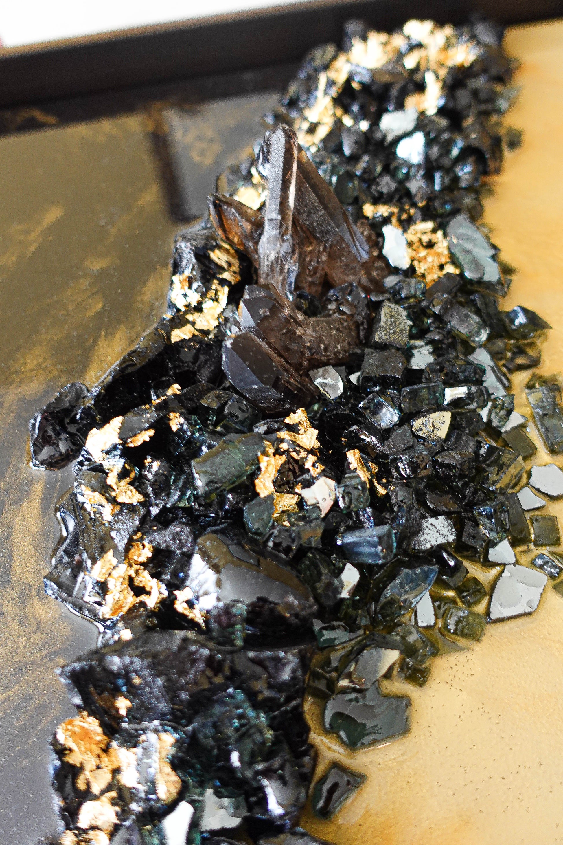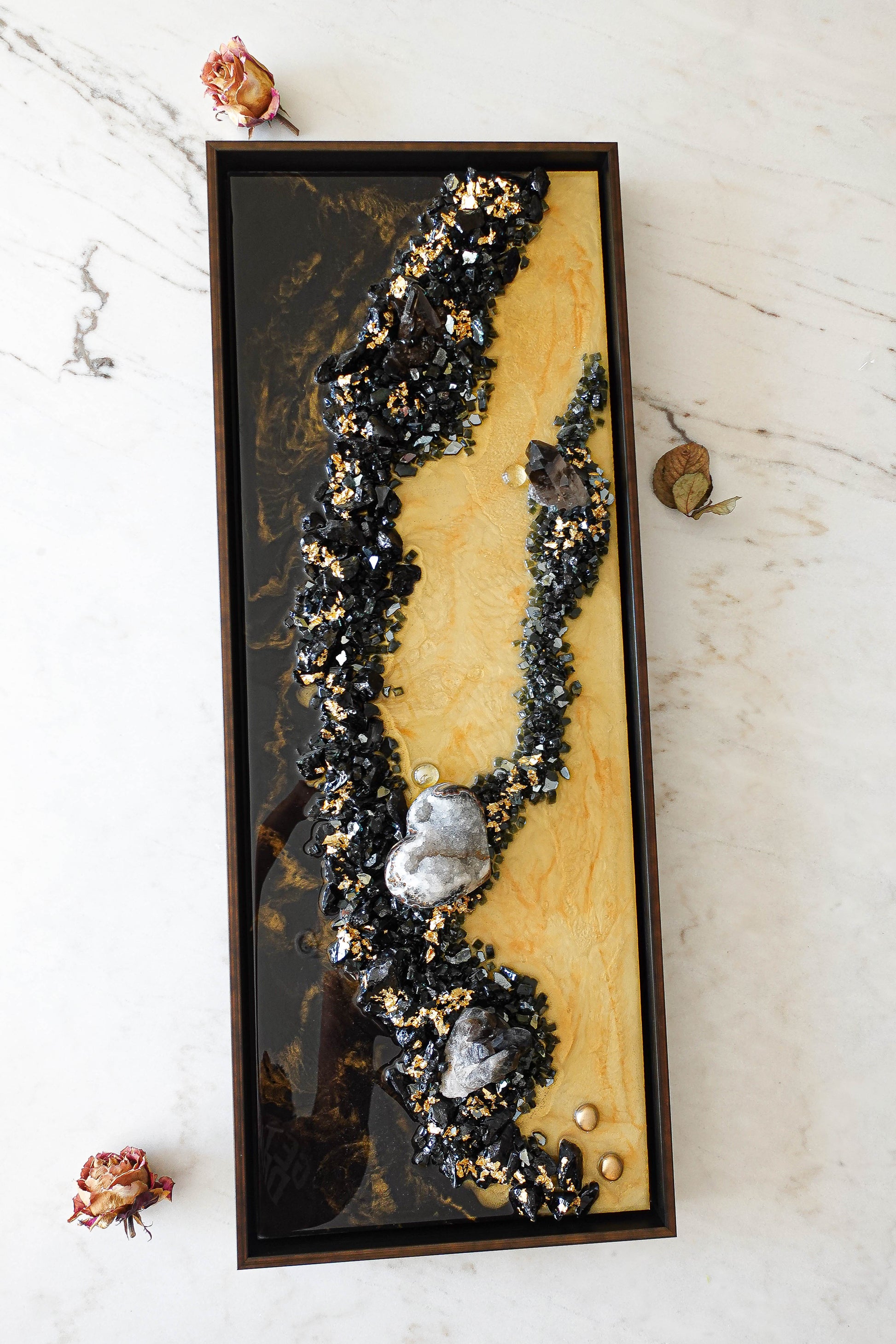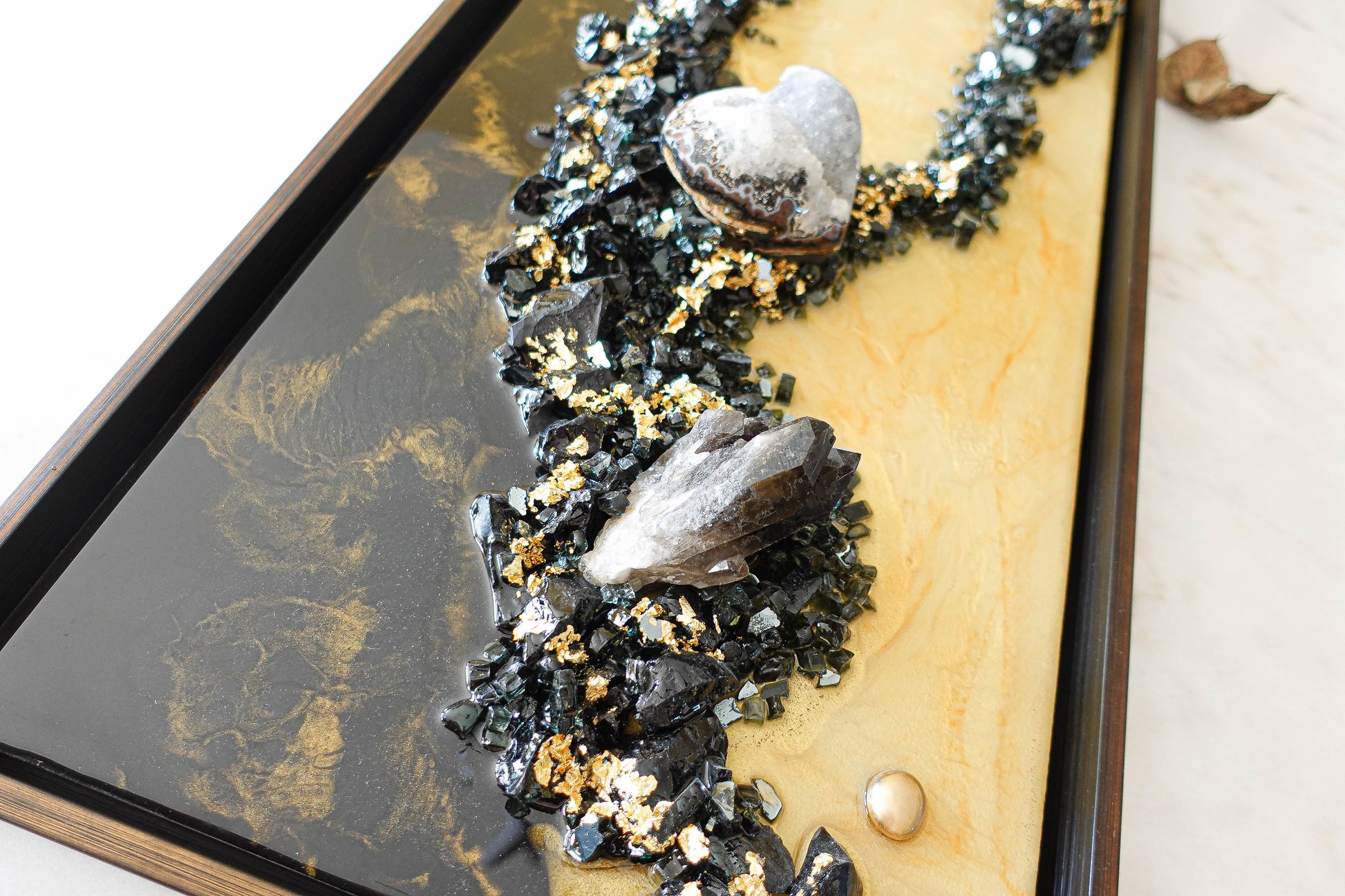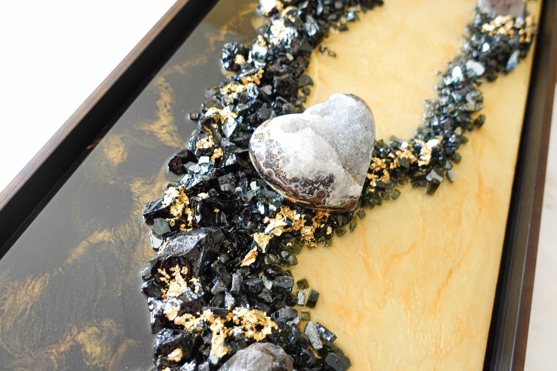 Indulge in the exclusive elegance of Black Heart. This artwork features a Dark Druzy Crystal Agate Heart, complemented by black fire glass and delicate gold foil accents. Let this sophisticated piece adorn your space with its tasteful and luxurious vibes.