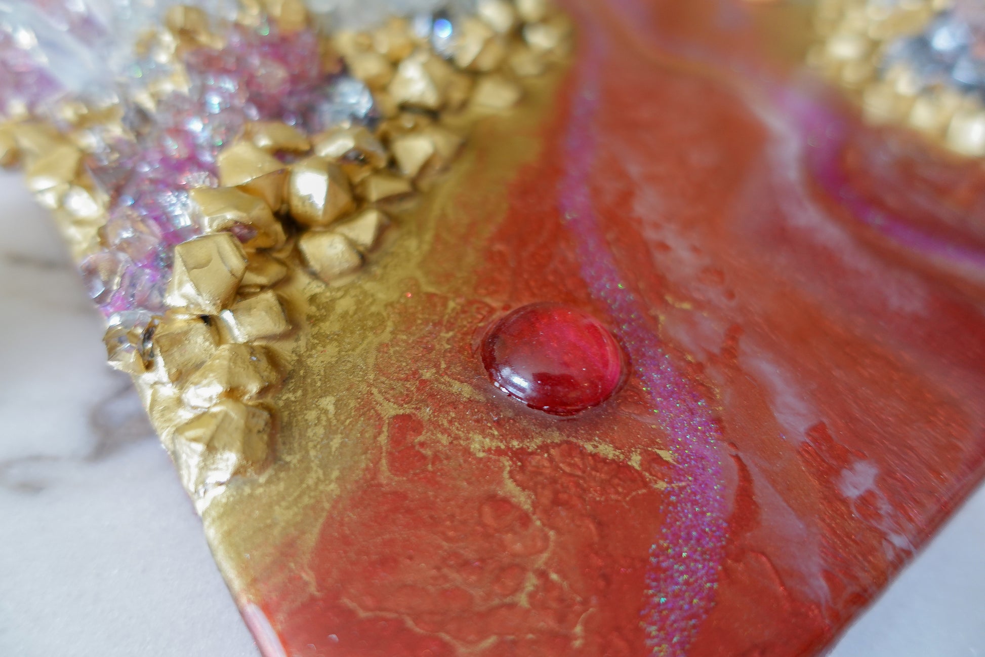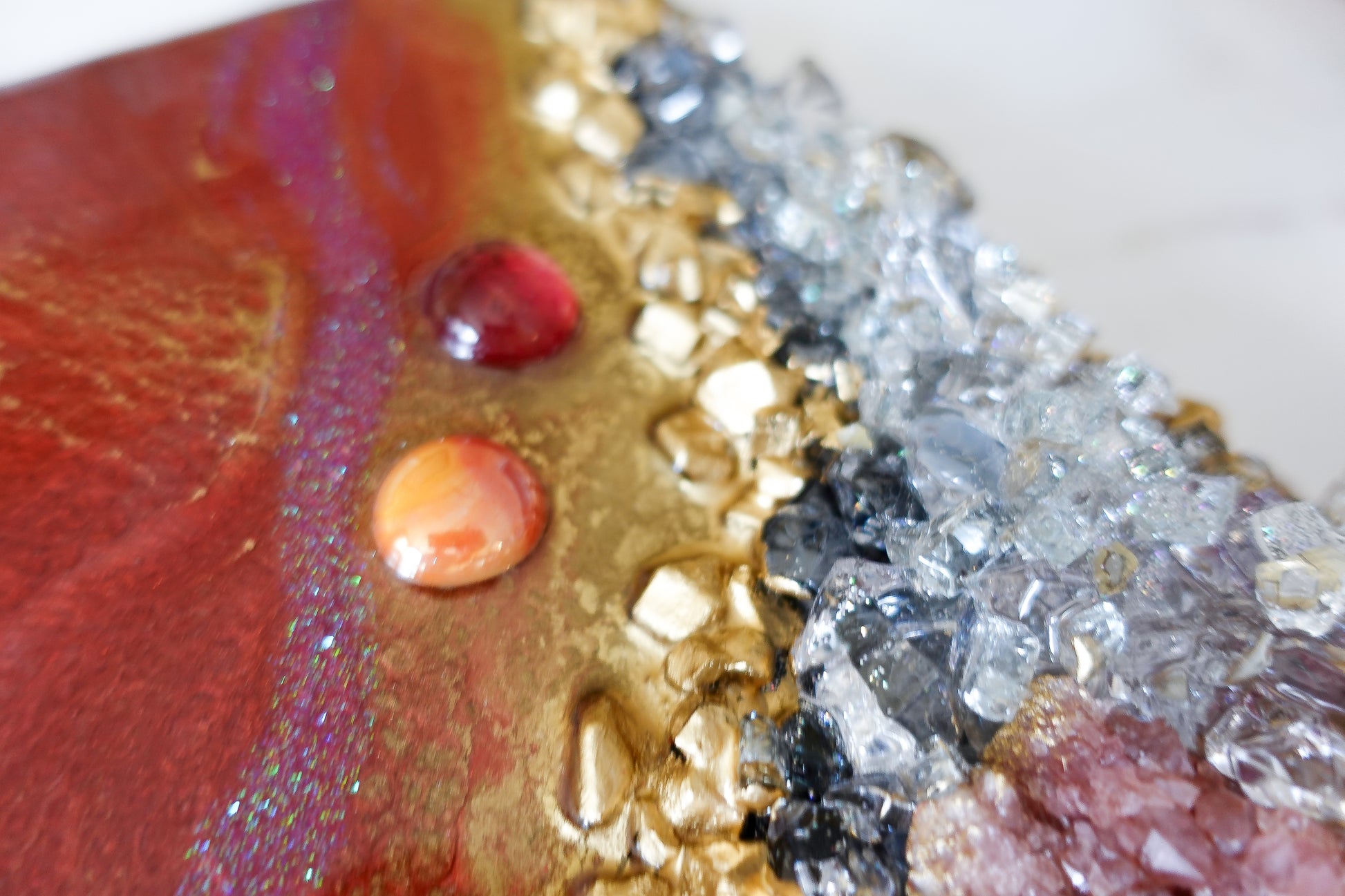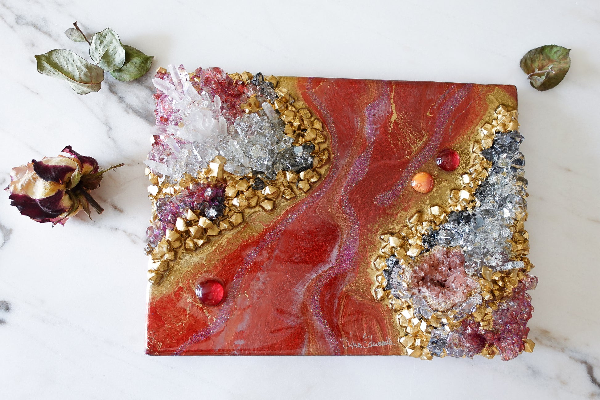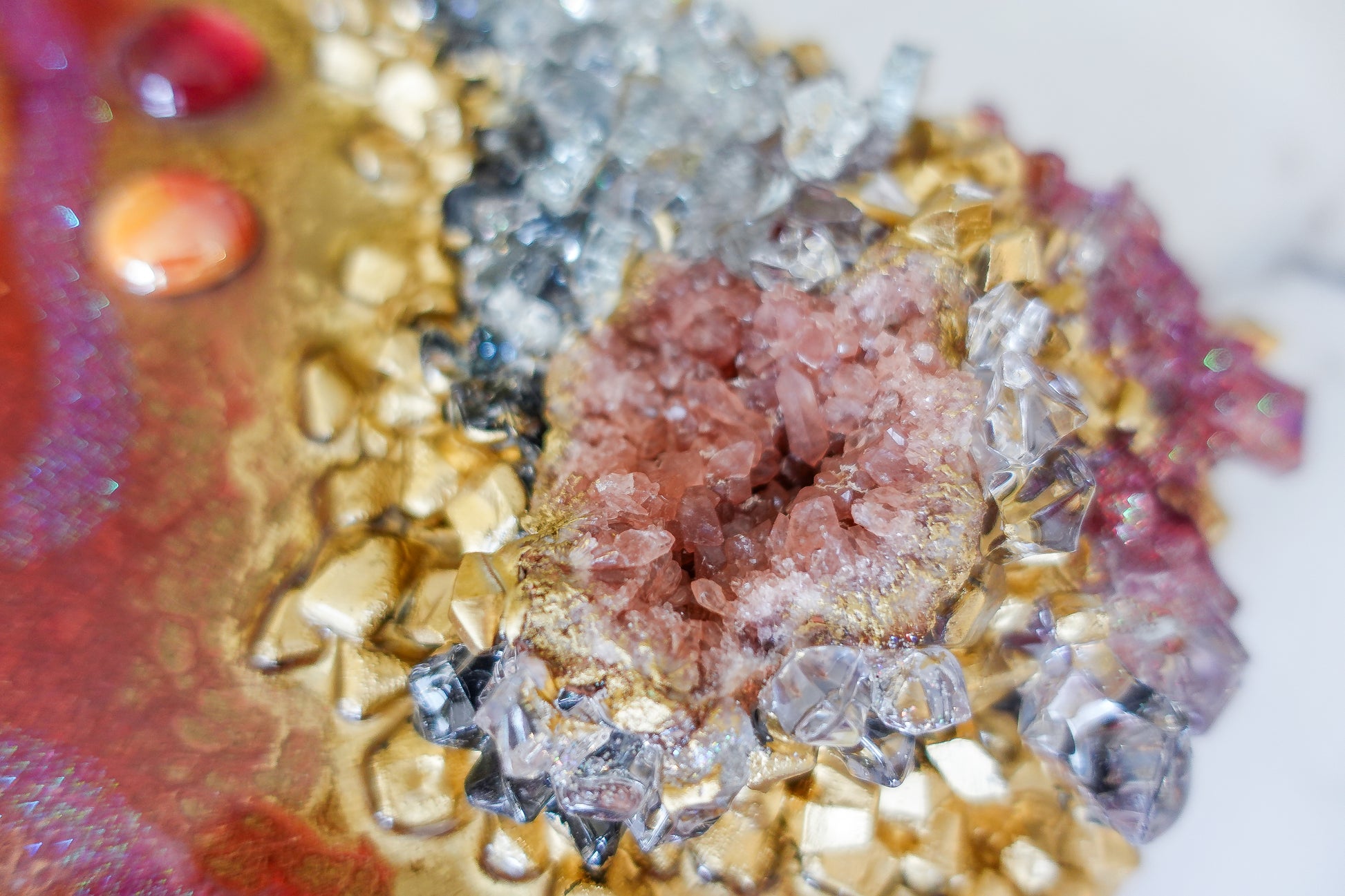 Adorn your space with the beautiful and luxurious Blush. Featuring a stunning rose quartz druzy, this accent piece adds a touch of elegance and sophistication to any décor. Indulge in its rosy tones and elevate your surroundings with this tasteful addition.